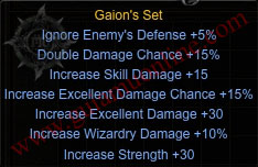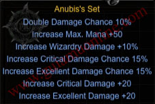 São 25% de Double Damage, 15% de Excellent Damage e mais 10% de Wizardry Damage, fazendo com que o MG utilizador da build de energia se encaixe perfeitamente neste set (O de força também faz bom uso do mesmo), é ótimo para poder upar, o Gaion's por si só é um ótimo set, o Anubi's é a cereja do bolo.